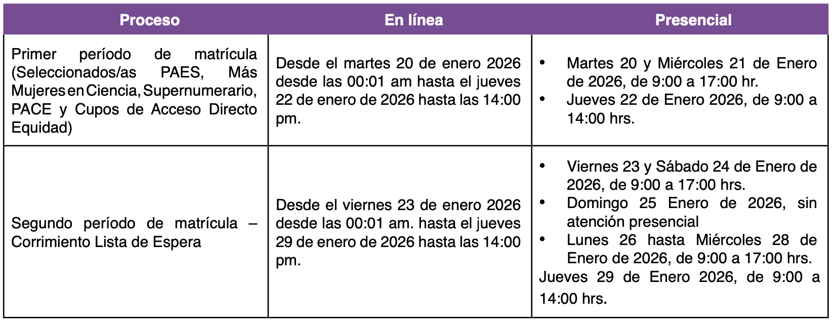 A continuación, podrás revisar las fechas importantes del Proceso de Matrícula 2026, tanto presencial, como en línea.